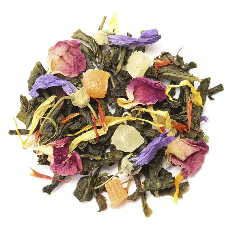 Состав: чай зеленый китайский крупнолистовой, кусочки ананаса, цветы мальвы, лепестки сафлора, лепестки розы красной, лепестки календулы, аромат персика и манго.