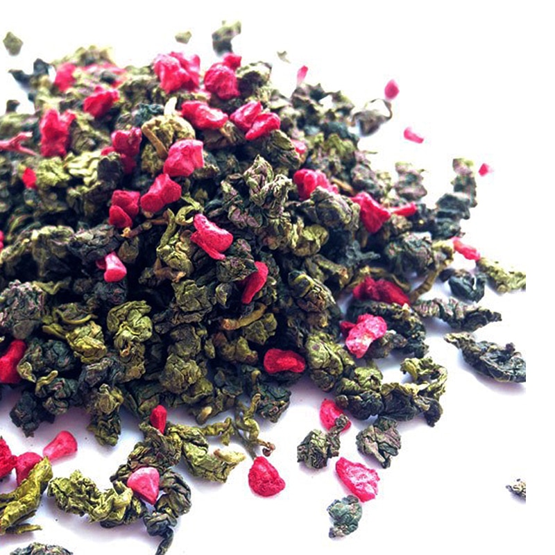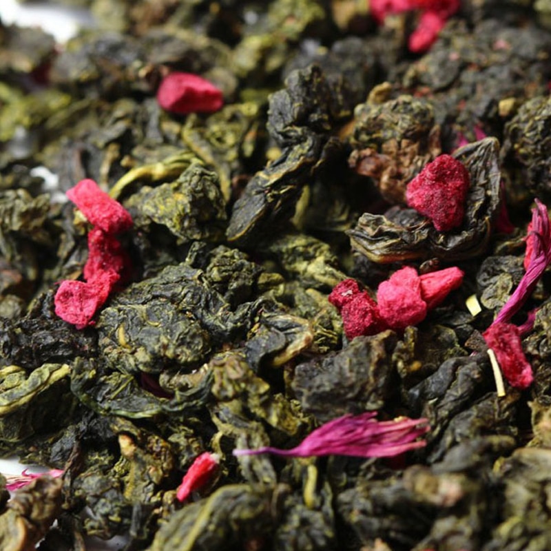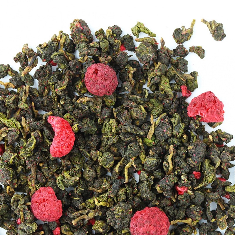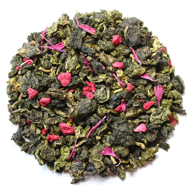 Состав: китайский зеленый чай, цельные кусочки малины и лепестки василька. Кусочки ягод блестят рядом с плотными шариками насыщенно-изумрудного цвета.